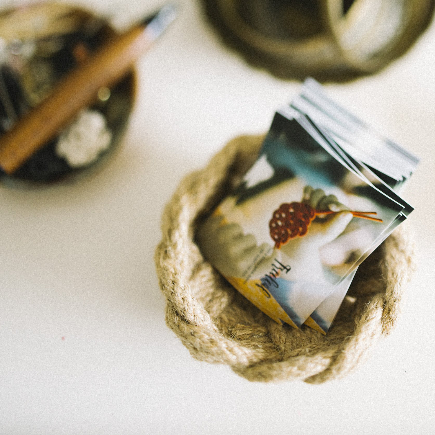 This small knotted bowl is truly one of a kind. Measuring approximately 4" wide by 2.5" tall, it is perfect as a small jewelry or change dish. Each bowl is handmade by a single strand of new 8mm rope.